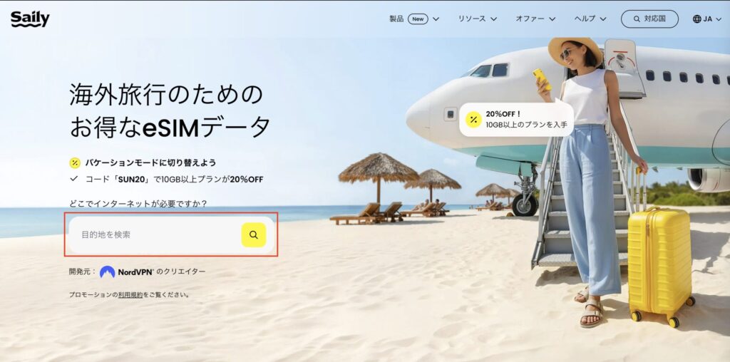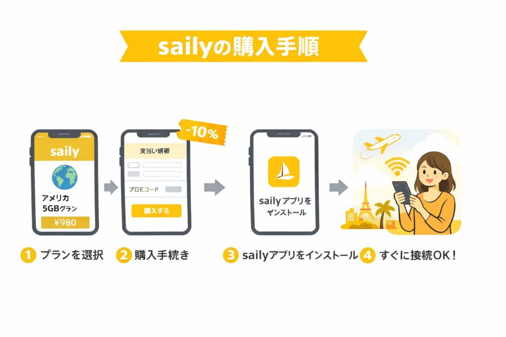 海外旅行用eSIMの購入は、初めての方にとって悩みがちなポイントです。このセクションでは、実際の公式サイトの画面イメージをもとに、Sailyの購入手順をステップ形式で整理しました。初めての方でも迷わず進められる流れになっています。