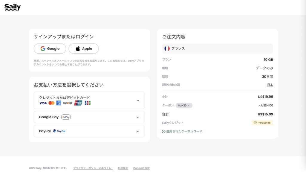 SailyのeSIM購入時には、チェックアウト画面で「クーポンをお持ちですか?」の欄にコードを入力すると、割引が適用されます。公式サポートでもこの手順が明記されており、購入前の入力が必須です。